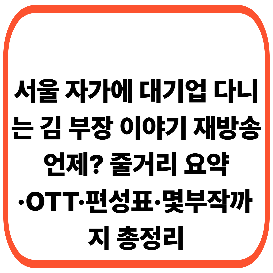 이 글에서는 서울 자가에 대기업 다니는 김 부장 이야기의 재방송 시간, 줄거리 요약, OTT 다시보기 방법, 편성표, 몇부작 정보, 원작 여부까지 다음 검색 상위노출을 위한 키워드 중심으로 완벽하게 정리해 드릴게요.